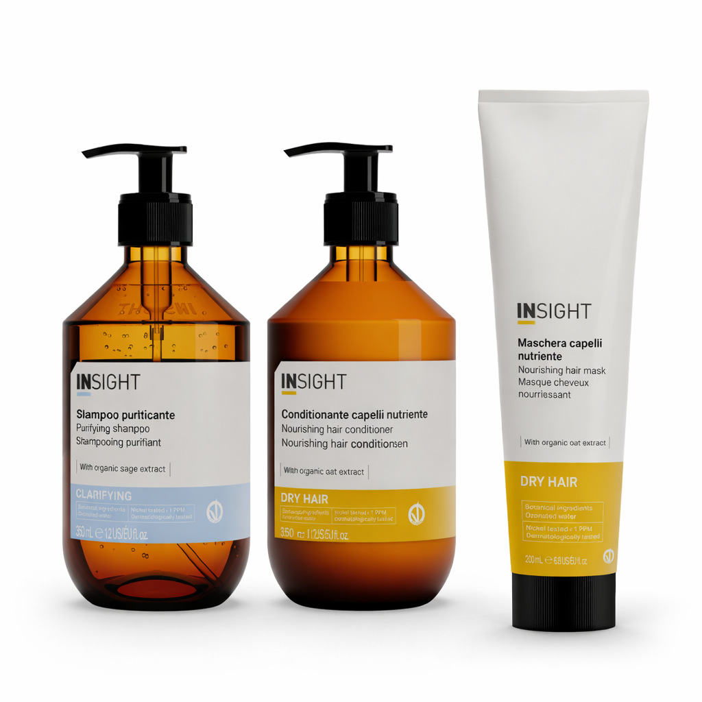 Rutina capilar INSIGHT diseñada para ayudar a controlar la caspa mientras nutre el cabello seco. El shampoo purificante limpia el cuero cabelludo y reduce la descamación, mientras el acondicionador y la mascarilla hidratan profundamente, dejando el cabello más suave, saludable y equilibrado sin resecar.
